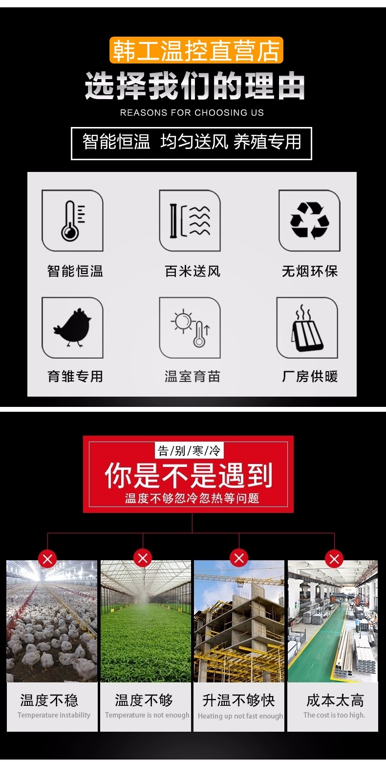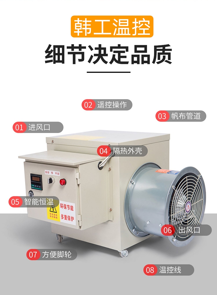 2.雙重自動過熱保護,手動重啟裝置.暖風啟動和自動冷卻停機裝置。電熱管預加熱到一定溫度后才自動啟動風扇,確保暖風即開即有;停止加熱后,風機自動運行一段時間確保整機冷卻到合適溫度后自動停機,增強了設備的安全性和操作的方便性,確保產(chǎn)品質(zhì)量.內(nèi)部導線采用硅膠線,延長使用壽命。